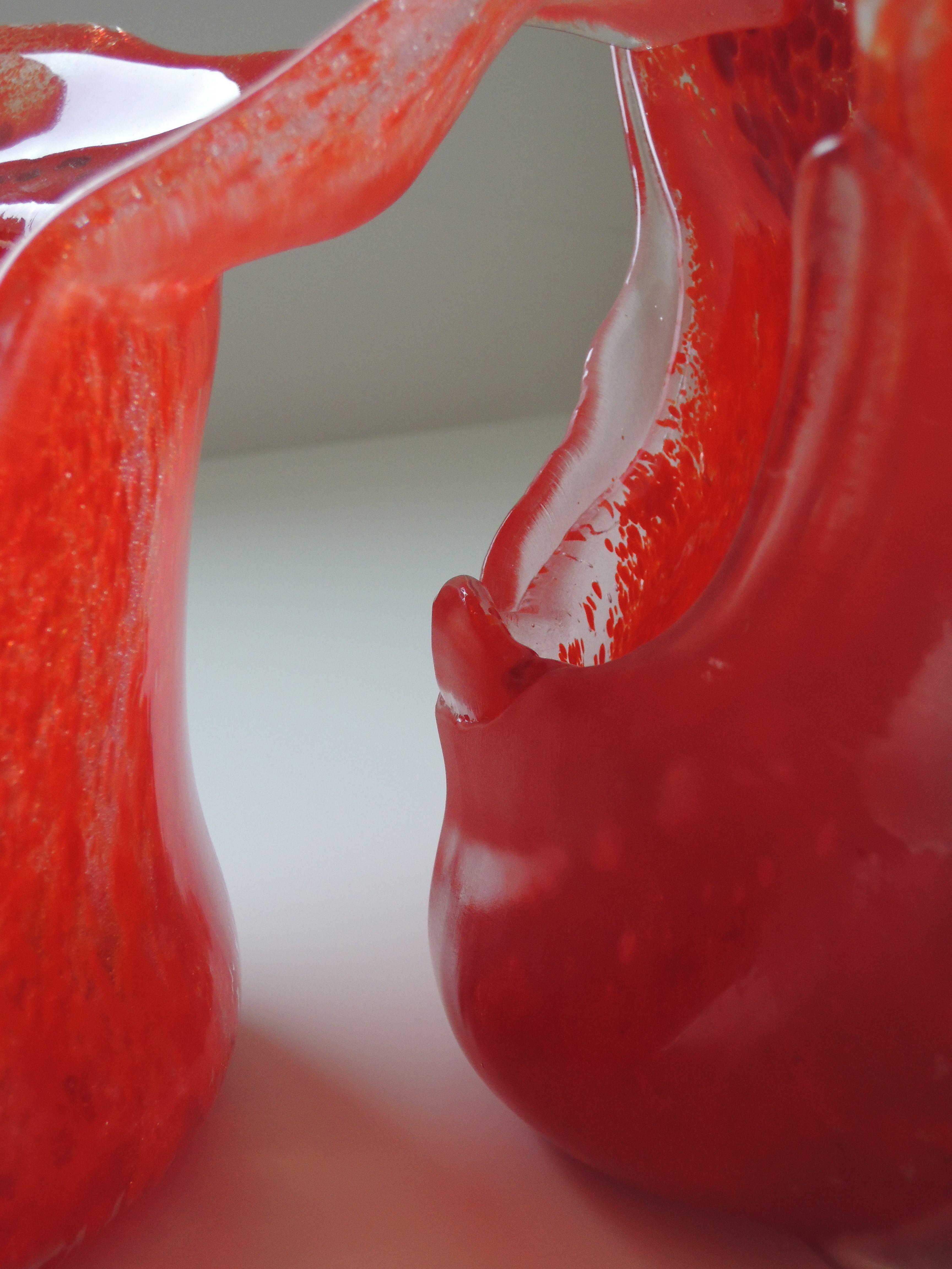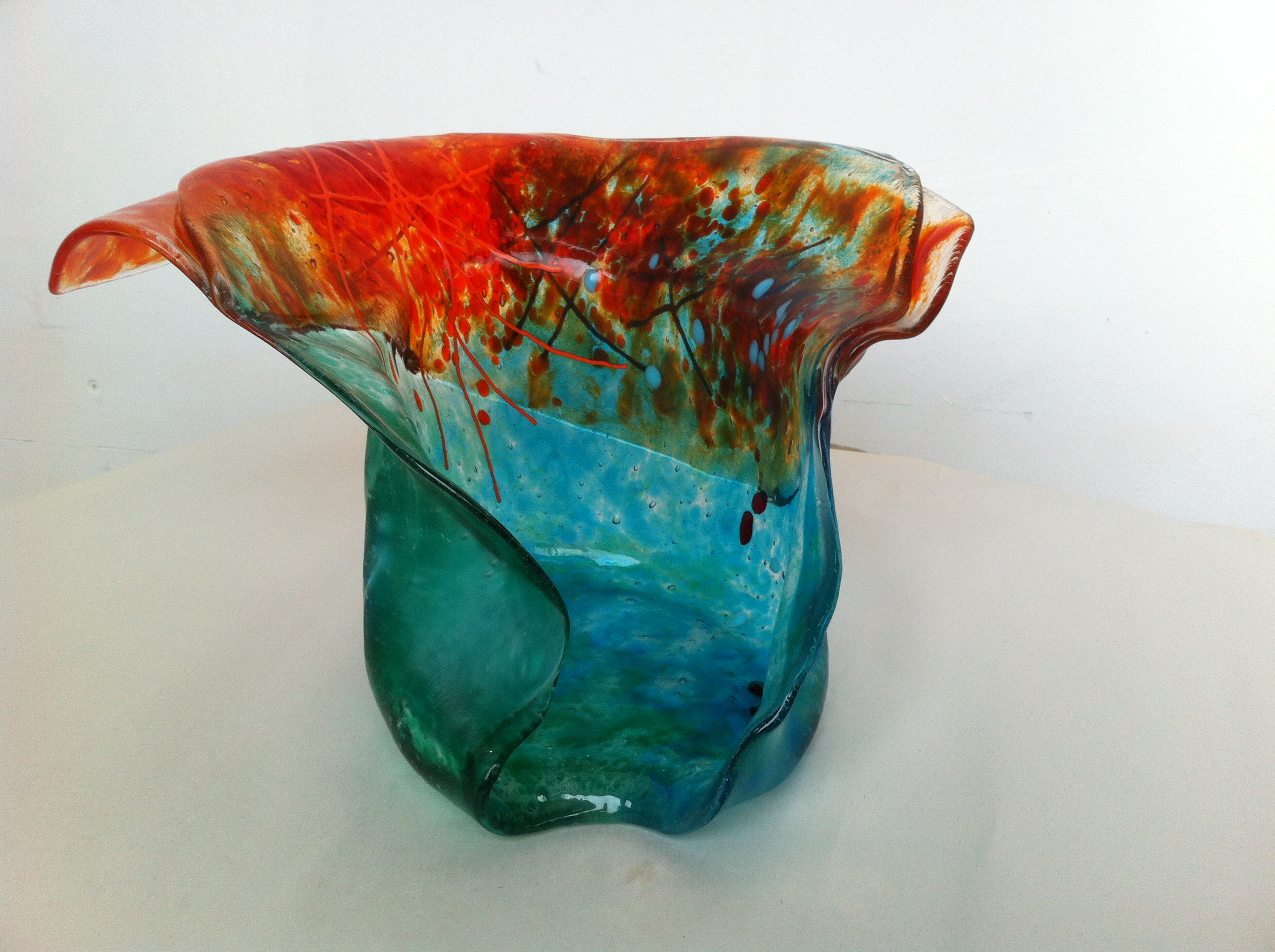 Warm glass, gravity and the vessels edge are explored in these pieces. The glass travels through the mould, urged downward through gravity and time, driven by heat and celebrated in the final firing. This process is visible on the glass surface. The work offers opportunities for reflection, engagement and a celebration of life. These vessels express discoveries pulled from emotional journeys, profound feelings and struggles. Both the colours and form are integral to this celebratory statement.