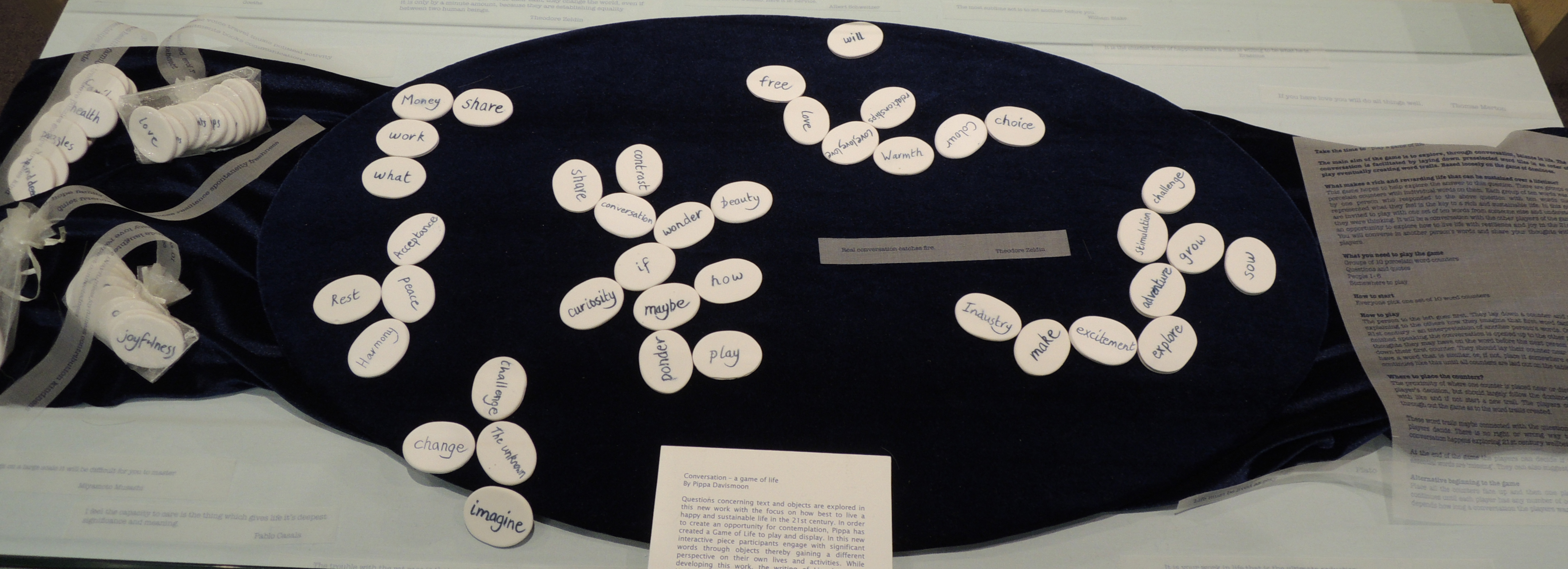 Questions concerning text and objects are explored in this new work with the focus on how best to live a happy and sustainable life in the 21st century. In order to create an opportunity for contemplation, I created: Conversation a game of life, to play and display. In this new interactive piece participants engage with significant words through objects thereby gaining a different perspective on their own lives and activities. While developing this work, the writing of Lisa Love and Nathaniel Kohn shaped my early thoughts on how objects can be souvenirs of events and may be a memory aid to internal emotional or aesthetic journeys.